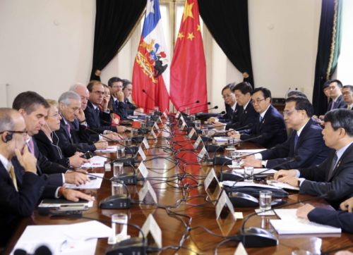 在中國國務院總理李克強與智利總統巴切萊特的見證下,中國商務部部長高虎城與智利外交部部長穆尼奧斯在智利首都圣地亞哥共同簽署《中華人民共和國商務部和智利共和國外交部關于中國—智利自由貿易協定升級的諒解備忘...
